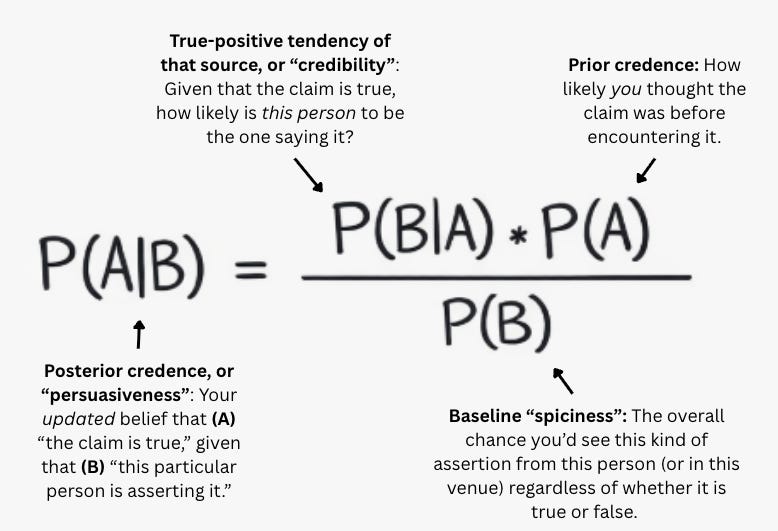 Think of it this way. In a low-trust environment, “credibility” becomes a scarce and valuable commodity. Instead of “if it’s true, how likely is this person to be the one saying it?” being the baseline, “if it’s false, how likely are they to say it anyway?” becomes the baseline. This is how you would approach an environment if you perceive everyone in it to be totally full of shit: “Credibility,” or P(B|A), takes on the low value of what P(B|not A) would typically be in a high-trust environment.