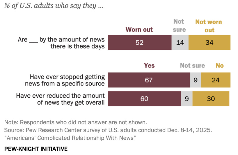 A recent Pew survey shows that about half of Americans say they are worn out by news, and many have tuned out: